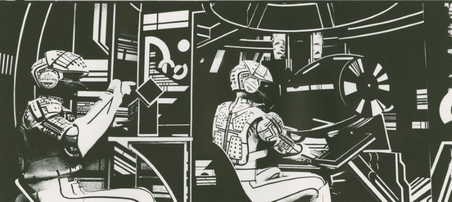 A photostat print from the Walt Disney Studios live action film "TRON" (1982). Featuring a pair of Tank Pilots, the photostat on paper print was created at the studio and used during the production of the special effects sequences in the film. The groundbreaking film predated modern-day computer animation and effects, requiring the unique lighting effects to be hand-created frame by frame. This painstaking process was only used for "TRON," making the film's effects artwork a special piece of movie history. Measuring 12"x20" overall and with the character image measuring 8.5"x19.25", the photostat print is in very good condition with minimal edge and corner wear, handling-related creasing, and light age-related discoloration.